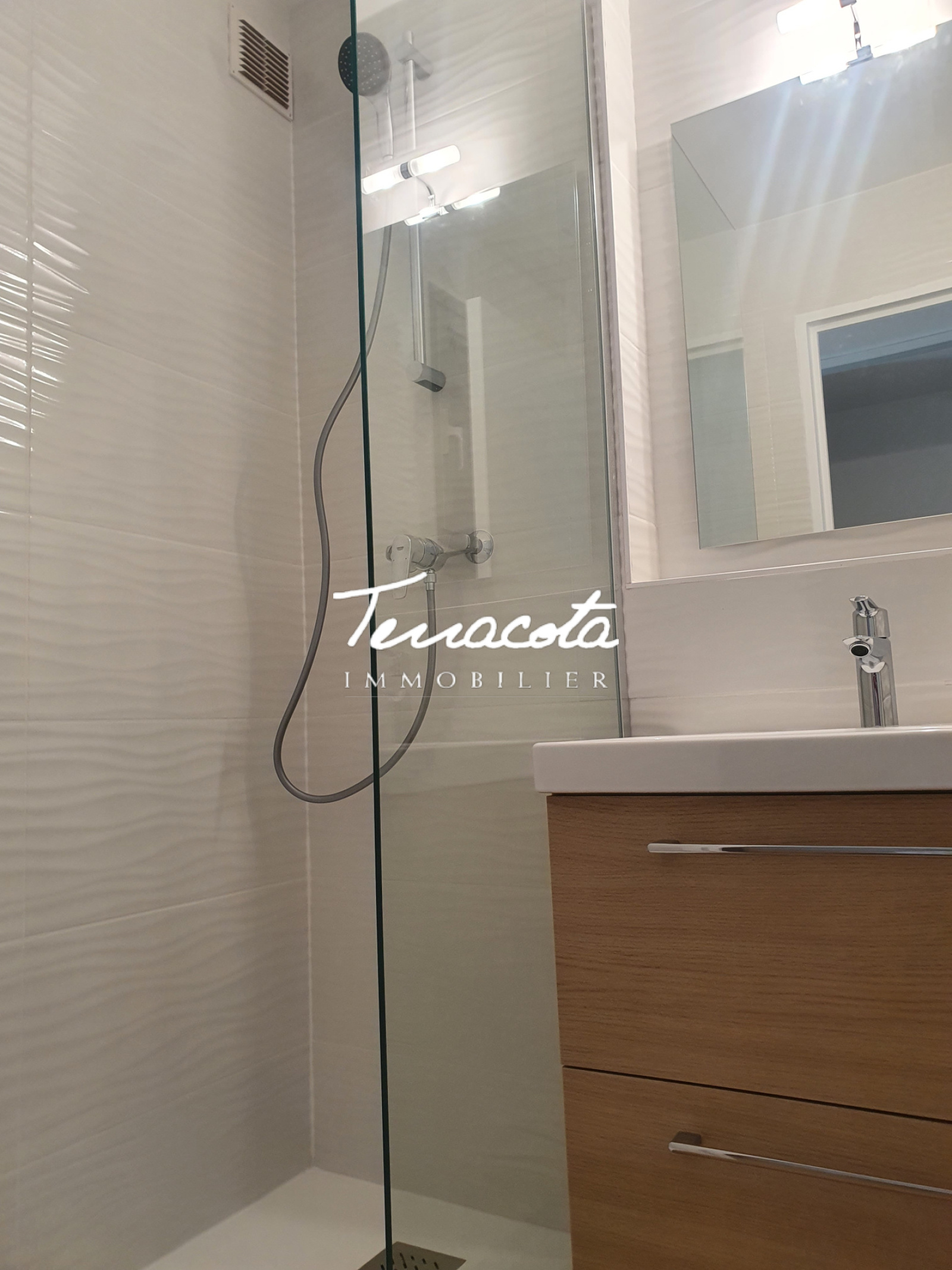 Il est composé d'une entrée équipée de nombreux rangements, d'une salle d'eau, d'une cuisine aménagée et semi équipée ouverte sur la pièce de vie, elle-même prolongée d'une terrasse de 14 m2.