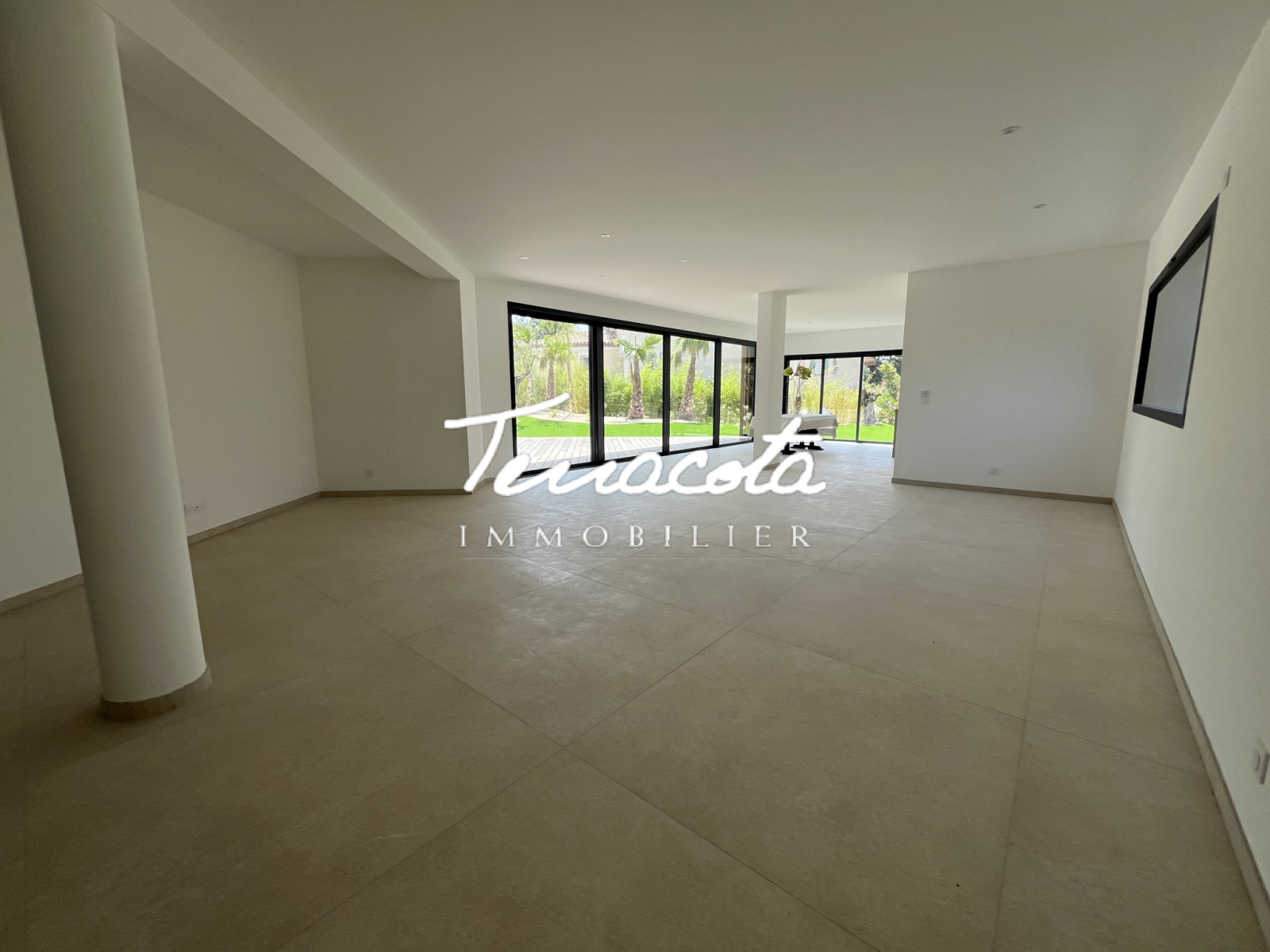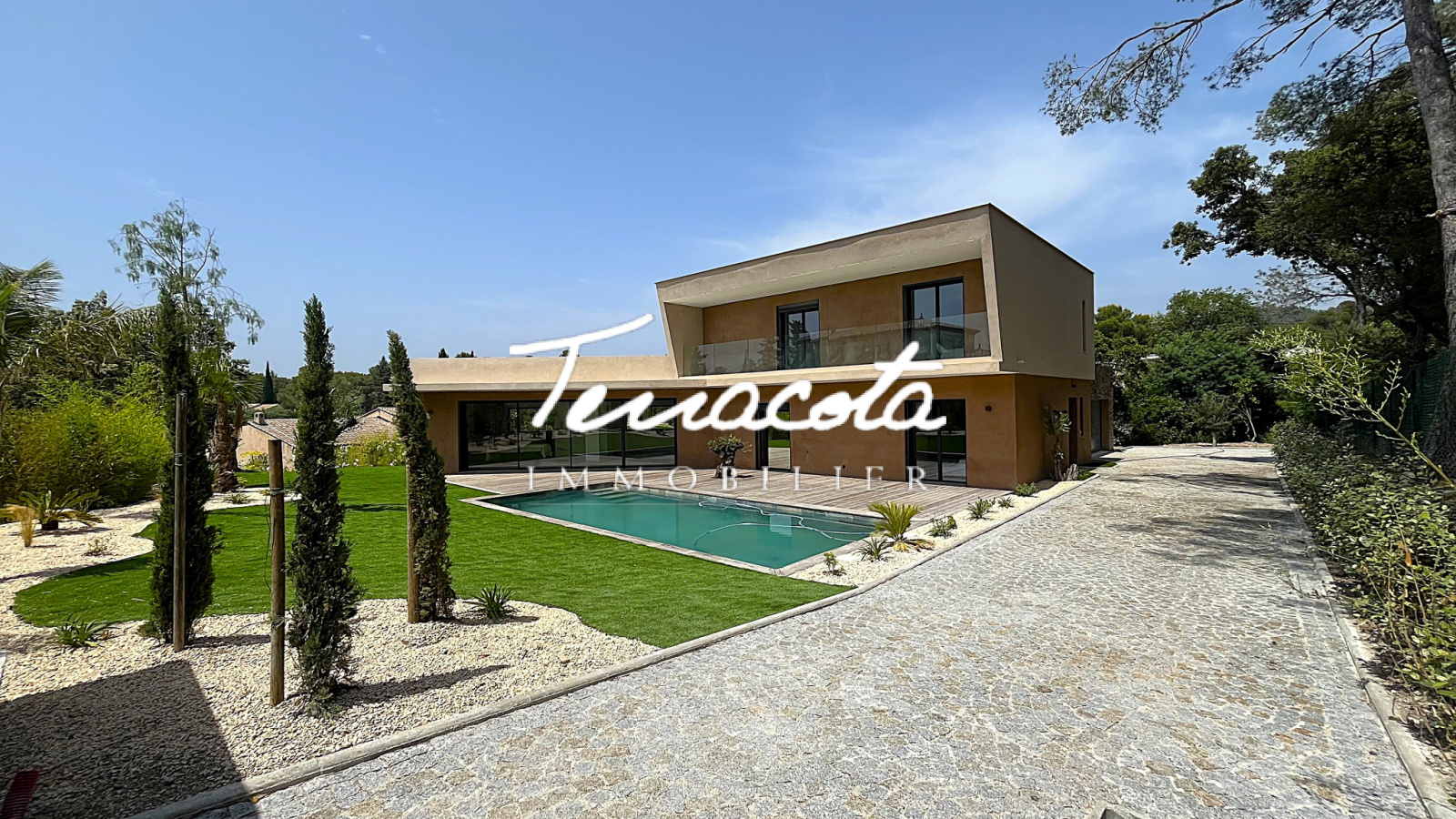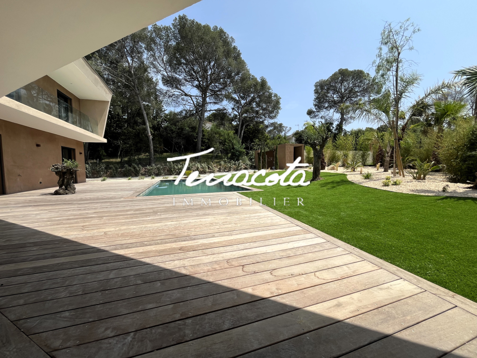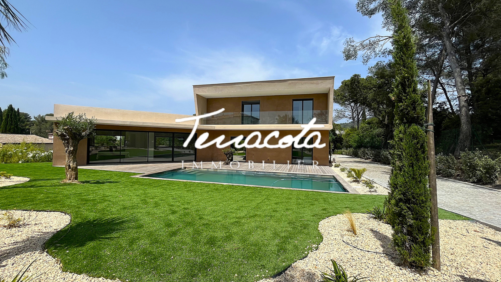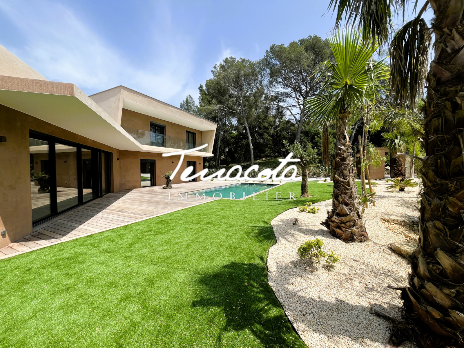Saint-Raphaël (83700)Boulouris, calme absolu en fond d'impasse, villa neuve 7 pièces de 288 m² composée d'un vaste double séjour de 90 m² avec cuisine équipée ouvrant sur terrasse plein sud avec piscine, 5 chambres avec salles de bains .Grande salle de sport et double garage. Prestations de qualité. Le tout sur une 1267 m² de terrain complanté.