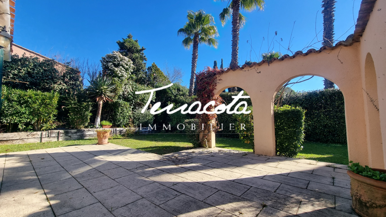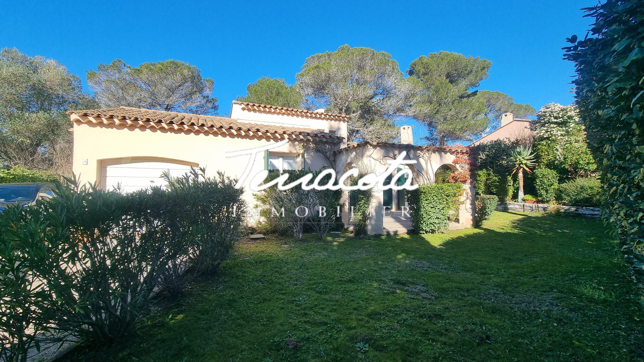 Le tout est édifié sur un terrain arboré de 685 m². La villa est en excellent état général. Au sein de la résidence sécurisée, vous bénéficiez également d’une piscine.